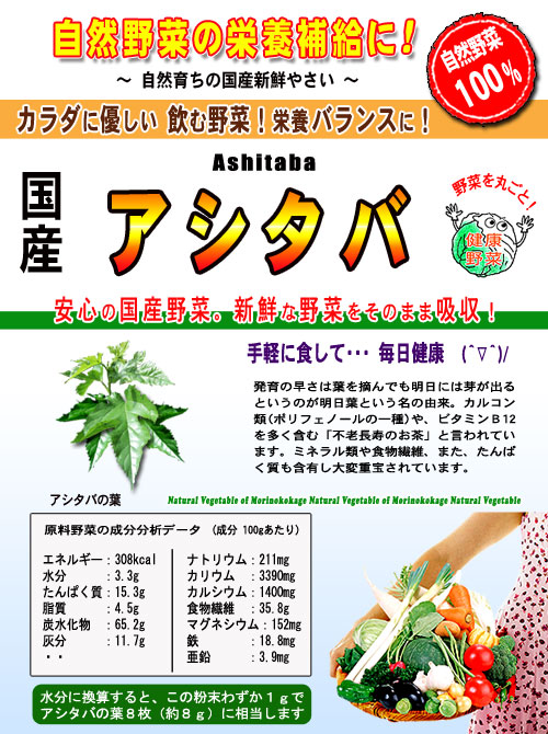 国産の自然やさいシリーズで日頃の野菜不足を解消!色々な野菜粉末をブレンドしお好みの野菜ドリンクを作って不足がちなお野菜一杯を健康のためにどうぞ。。。野菜サラダが苦手な方も簡単に溶かしてぐい〜っとドリンクで!また、スープにしたりお菓子やケーキ素材等、お料理にもOK!アシタバは、食物繊維が豊富!!カルシウムやカリウム・ビタミンB2・鉄などが含まれており、栄養価がとっても高〜い!また、豊富な栄養素に加えて、有機ゲルマニウムなどを含むため、昔から「不老長寿の妙薬」として珍重されています。