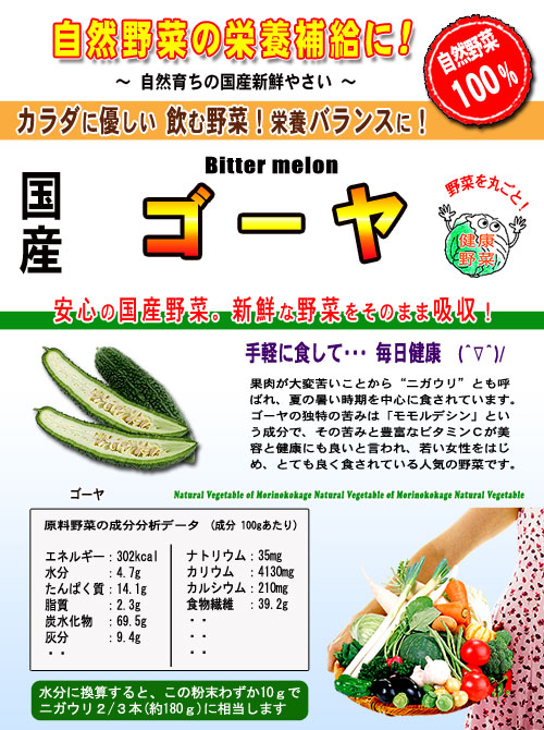 国産の自然やさいシリーズで日頃の野菜不足を解消!色々な野菜粉末をブレンドしお好みの野菜ドリンクを作って不足がちなお野菜一杯を健康のためにどうぞ。。。野菜サラダが苦手な方も簡単に溶かしてぐい〜っとドリンクで!また、スープにしたりお菓子やケーキ素材等、お料理にもOK!ゴーヤの特徴はあのさわやかな苦味!苦手な人もいますが、ゴーヤの苦味はモモルジシンという成分などで、重要成分!さまざまな健康効果が知られていますが夏バテ等によいとされる健康野菜です。 ビタミンC、カロテン、カリウム、たんぱく質が豊富に含まれ、ゴーヤに含まれるビタミンCは過熱によってもほとんど失われないのが特徴です。また、カロテンは体内でビタミンAに変換されるというのだからびっくり@@。「夏を乗り切る健康成分はビタミンCと独特の苦味」です!