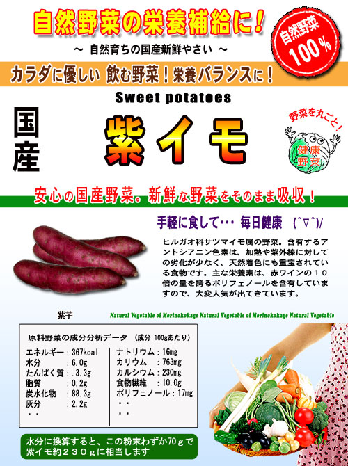 国産の自然やさいシリーズで日頃の野菜不足を解消!色々な野菜粉末をブレンドしお好みの野菜ドリンクを作って不足がちなお野菜一杯を健康のためにどうぞ。。。野菜サラダが苦手な方も簡単に溶かしてぐい〜っとドリンクで!また、スープにしたりお菓子やケーキ素材等、お料理にもOK!紫イモは、甘味が強くてカロリーが低い、でも栄養価は高い!女性に喜ばれる「理想的な美容食」ともいえるでしょう。その上、アントシアニンが豊富!!さらに、ポリフェノールの含有量は、赤ワインの10倍もあると言われます。また、ビタミンも豊富なので、美容と健康を気にしてるあなたにもおすすめです☆