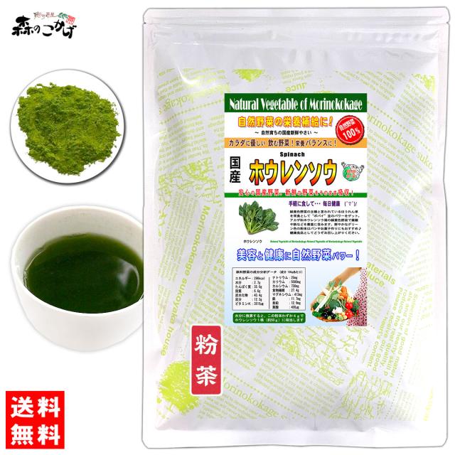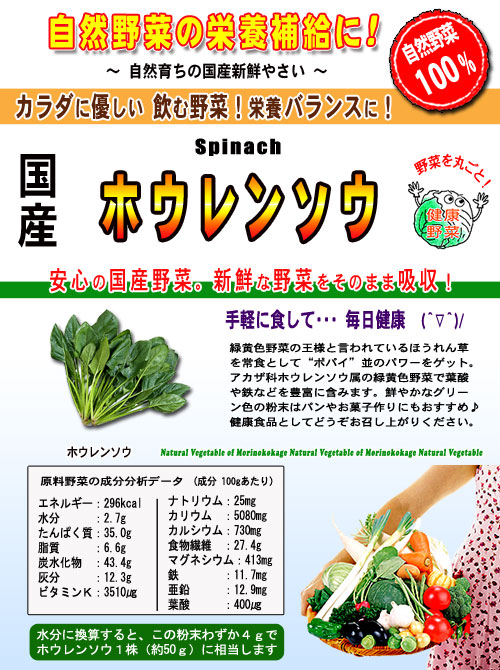国産の自然やさいシリーズで日頃の野菜不足を解消!色々な野菜粉末をブレンドしお好みの野菜ドリンクを作って不足がちなお野菜一杯を健康のためにどうぞ。。。野菜サラダが苦手な方も簡単に溶かしてぐい〜っとドリンクで!また、スープにしたりお菓子やケーキ素材等、お料理にもOK!ホウレンソウは「緑黄色野菜の王様」という別名もあるほどで、鮮やかな緑色の中に、さまざまな栄養素が、バランスよく入った、緑黄色野菜の代表格です。 特にカロテンと鉄分の含有量は、野菜の中でも1、2位を争うもので、体内での重要なお仕事をしてくれます。ホウレンソウは、パソコンの利用が多い現代人にはもっとも貴重な野菜ともいえるでしょう。また、たっぷりの鉄とその吸収を高めるビタミンCが多く含まれております。