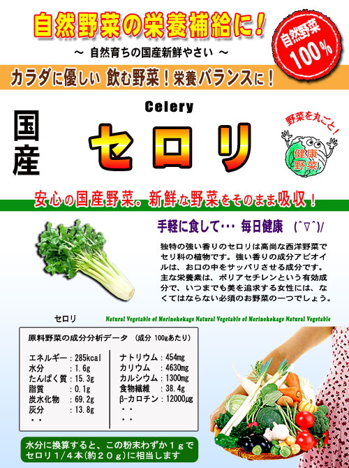 国産の自然やさいシリーズで日頃の野菜不足を解消!色々な野菜粉末をブレンドしお好みの野菜ドリンクを作って不足がちなお野菜一杯を健康のためにどうぞ。。。野菜サラダが苦手な方も簡単に溶かしてぐい〜っとドリンクで!また、スープにしたりお菓子やケーキ素材等、お料理にもOK!セロリは、ビタミンやミネラルをバランスよく含むヘルシー野菜、食物繊維も多く、ダイエットにも有効。緑が濃い葉の部分には、ビタミンB1・B2・βーカロチンが特に豊富です。独特の強い香りや苦みは、精油成分やポリフェノールのアピインなどによるもの。特にポリアセチレンという有効成分には、健康維持はもちろんの事、年を重ねていくことに嬉しい結果が期待できそうです♪