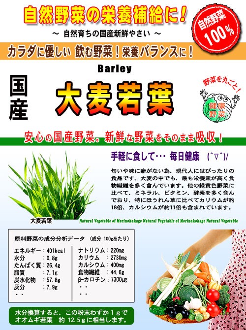 国産の自然やさいシリーズで日頃の野菜不足を解消!色々な野菜粉末をブレンドしお好みの野菜ドリンクを作って不足がちなお野菜一杯を健康のためにどうぞ。。。野菜サラダが苦手な方も簡単に溶かしてぐい〜っとドリンクで!また、スープにしたりお菓子やケーキ素材等、お料理にもOK!大麦若葉は、他の野菜に比べてビタミンやミネラル、酵素の量が豊富!ほうれん草と比べると、カリウムは約18倍、カルシウムは約11倍、マグネシウムは約4倍の量。 ビタミンB1は牛乳の約30倍、ビタミンB1とCは、それぞれほうれん草の約6.5倍と33倍も含まれています。