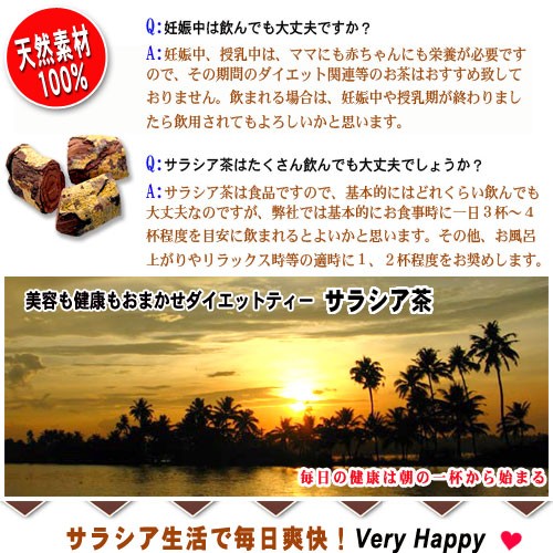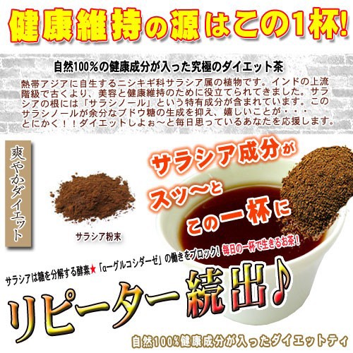 「サラシア茶」は、インドや熱帯アジアに自生する植物の根が原料。インドの上流階級で古くより、ダイエットのサポートや健康維持に利用されてきました。サラシアの根に含まれる「サラシノール」という特有成分が含まれています。毎日の健康維持などにおすすめです。