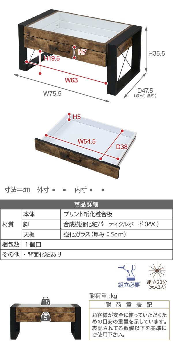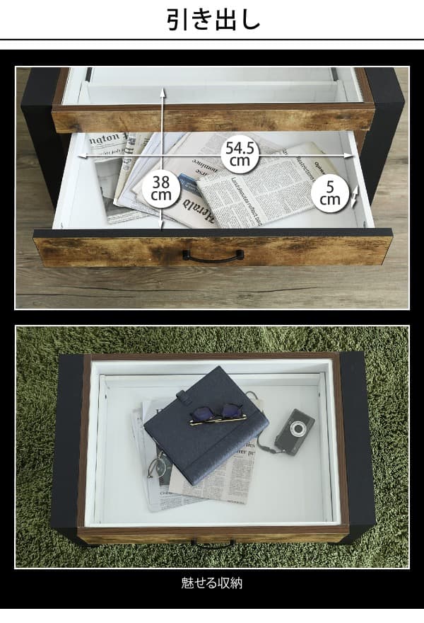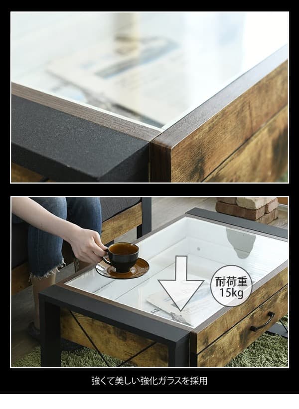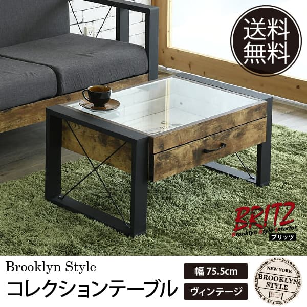 送料無料 ブルックリンスタイル コレクション センターテーブル 幅75 奥行48 高さ35 引き出し ガラス テーブル ローテーブル