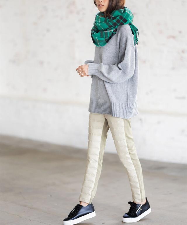 【新色追加】前はダウン、後ろを裏起毛のカットソー素材で切替えたパンツ。後側にカットソーを使うことで程よく脚にフィットし、暖かさときれい見えを両立。ウエスト総ゴム仕様でラクちん。