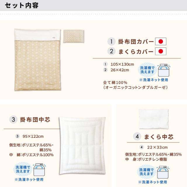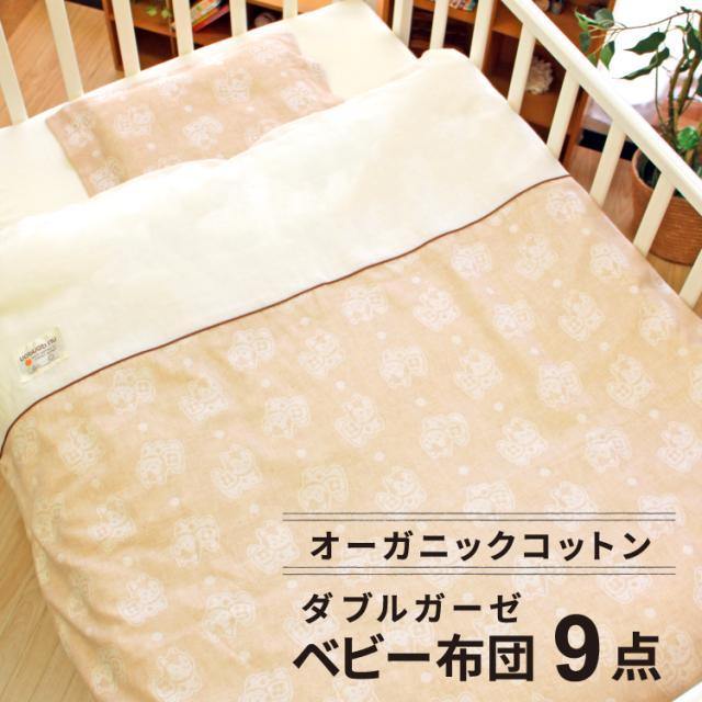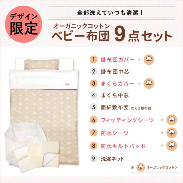 化学薬品不使用のオーガニックコットンダブルガーゼベビー布団は9点セット。