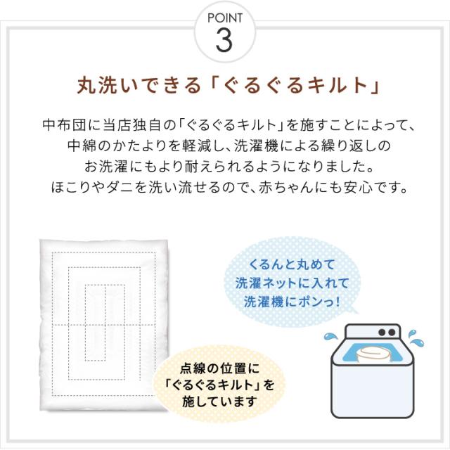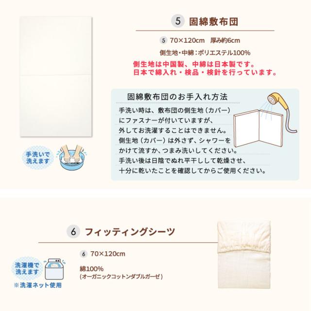 【1】掛布団カバー<105×130cm> ■日本製 綿100%(オーガニックコットンダブルガーゼ) 【2】掛布団中芯<95×122cm>(重量:約300g) ■中国製 側生地/ポリエステル65%・綿35% 中綿/ポリエステル100% 【3】枕カバー<26×42cm> ■日本製 綿100%(オーガニックコットンダブルガーゼ) 【4】枕中芯<22×33cm> ■中国製 側生地/ポリエステル65%・綿35% 中身/ポリエチレン樹脂 【5】固綿敷布団<70×120cm(厚み6cm)> ■側生地:中国製 中綿:日本製 側生地・中綿/ポリエステル100% 【6】フィッティングシーツ<70×120cm> ■中国製 綿100%(オーガニックコットンダブルガーゼ) 【7】防水シーツ<70×120cm> ■中国製 綿100%(パイル部分・オーガニックコットンパイル) ポリエステル100%(地糸) (裏側ポリウレタンラミネート加工) 【8】防水キルトパッド<70×120cm> ■中国製 表側/綿100%(パイル部分・オーガニックコットンパイル) ポリエステル100%(地糸) 中綿/ポリエステル100% (裏側ポリウレタンラミネート加工) 【9】洗濯ネット<直径40×高さ50cm> ■中国製 ポリエステル100% 内寸サイズが長さ120cm×幅70cmのベビーベッドに対応しています。 |