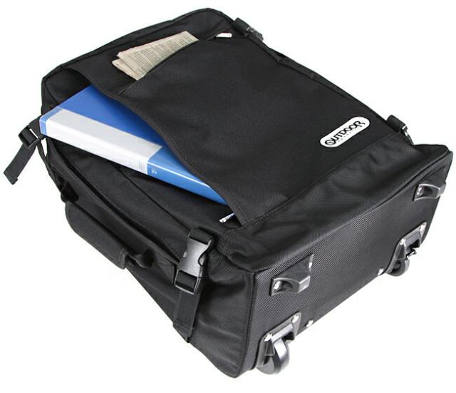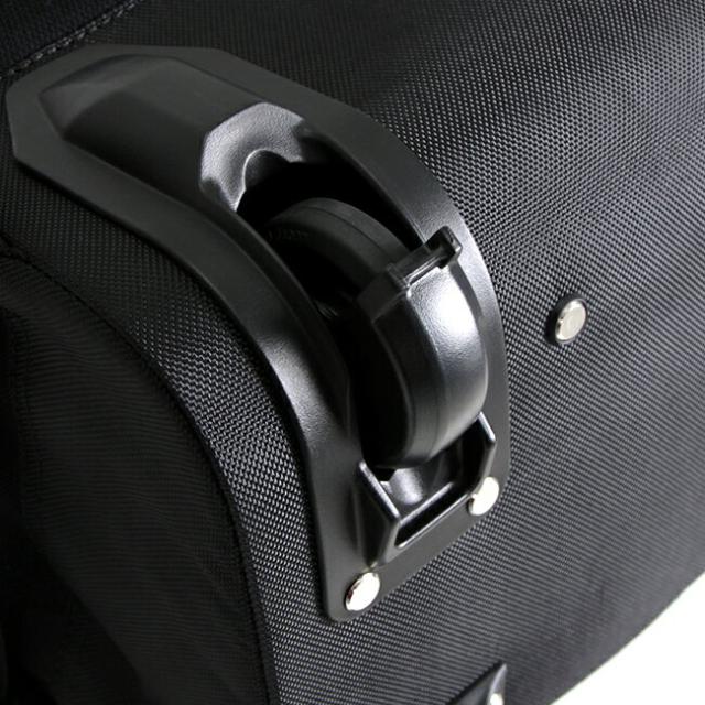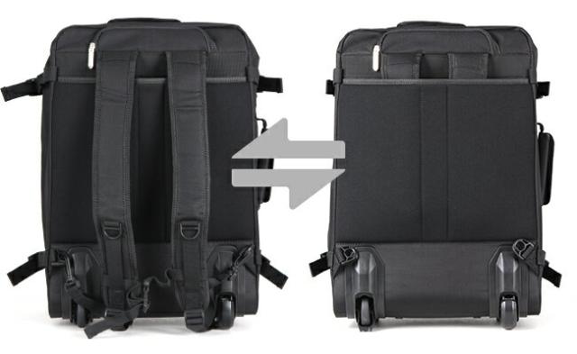 | 背負った際に背中が汚れないワンタッチカバー付きキャスター付き。 |