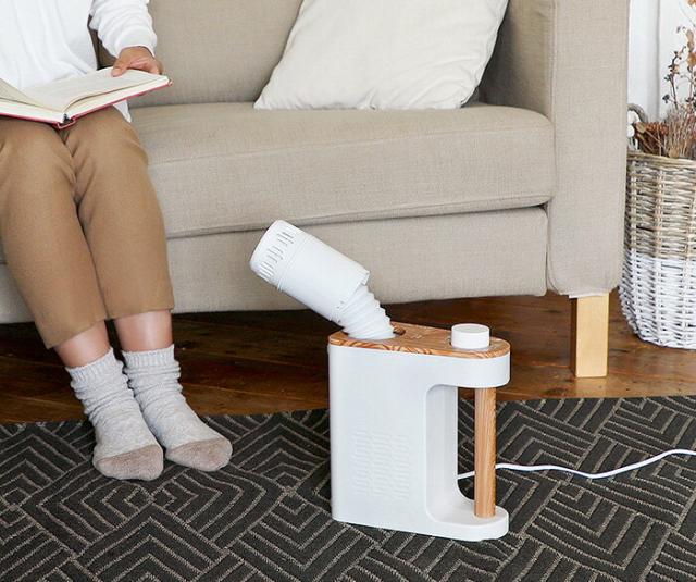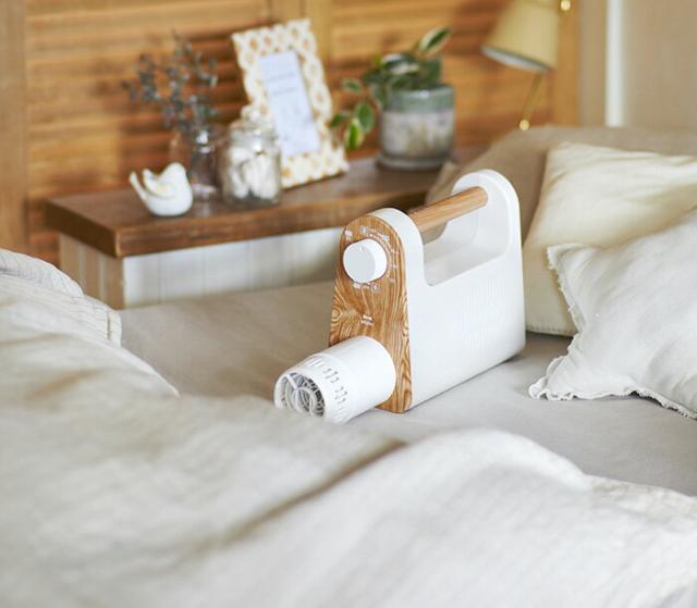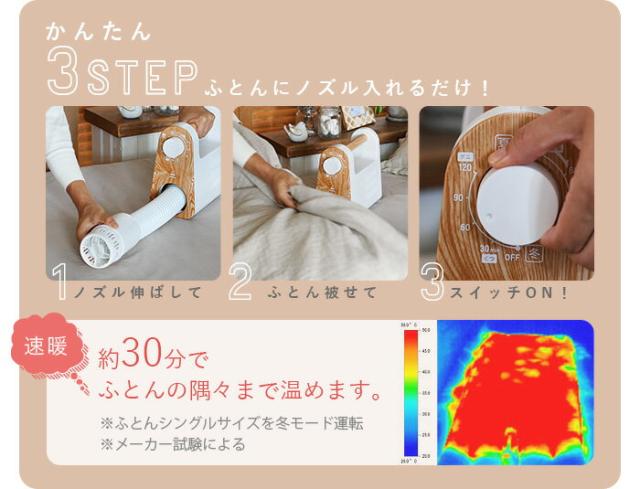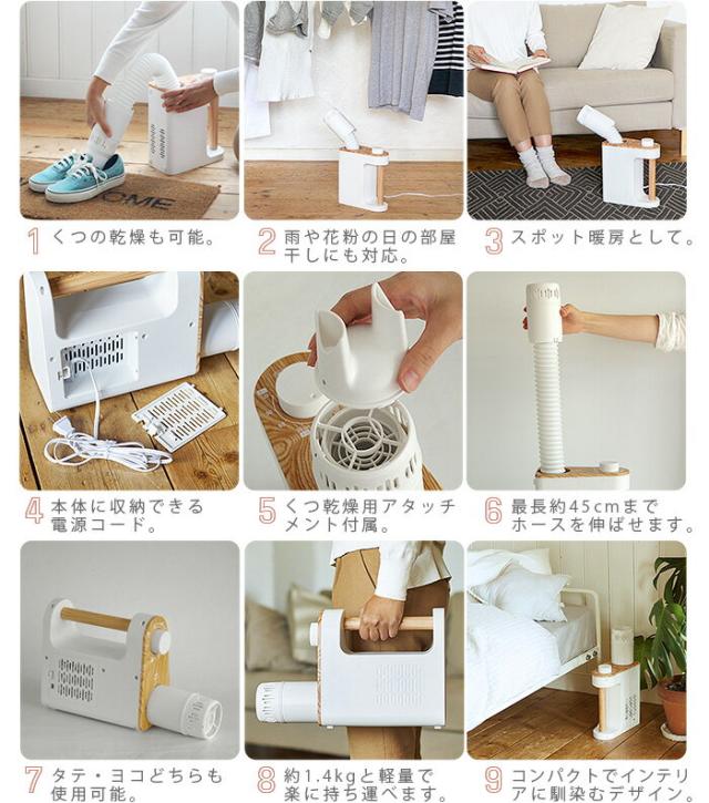 マット不要、布団に伸縮式のノズルを入れるだけで、湿気をとばしてホカホカなお布団に仕上げてくれる、1台で多用途な布団乾燥機です。手軽に布団乾燥ができるから、マンションの規約などで布団を天日干しできないご家庭や布団干しが苦労なご年配の方には特におすすめです。寒い冬には布団の温めとして毎日大活躍!速暖タイプだから就寝30分前、お風呂に入る前などにセットしておけば、冬のひんやり布団も隅々まで温まります。布団の温めやダニ対策以外にも衣類乾燥や靴の乾燥もOKだから、梅雨や花粉のシーズンには重宝します。さらに夏モードやタイマー機能も搭載し、1年中使いやすいモデルです。ちょっと足元が冷える時などのスポット暖房としても使え、多用途で無駄がありません。コンパクトボディに木目調のハンドルでインテリアにも馴染むデザインだから出しっぱなしでもOK。