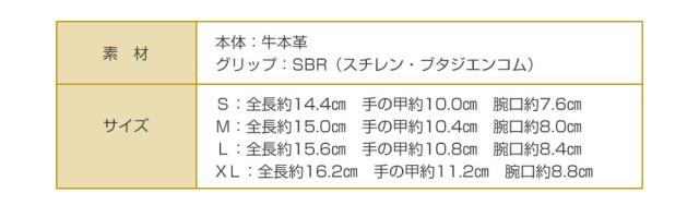 | サイズ | S:全長約14.4cm、手の甲約10.0cm、腕口約7.6cm M:全長約15.0cm、手の甲約10.4cm、腕口約8.0cm L:全長約15.6cm、手の甲約10.8cm、腕口約8.4cm XL:全長約16.2cm、手の甲約11.2cm、腕口約8.8cm |