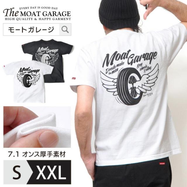 タイヤに羽のはえたデザインは、バイカーを始め、タトゥーの柄でも人気のデザイン。どこまでも自由に行きたいと言うメッセージのこもった、男らしいバックプリントデザインが人気のアメカジTシャツ。 ブランド:Moat Garage / モートガレージ