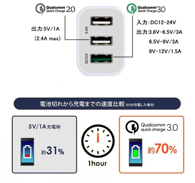※Quick Charge充電をご使用になる場合は、Quick Charge充電に対応したケーブルをご使用ください。