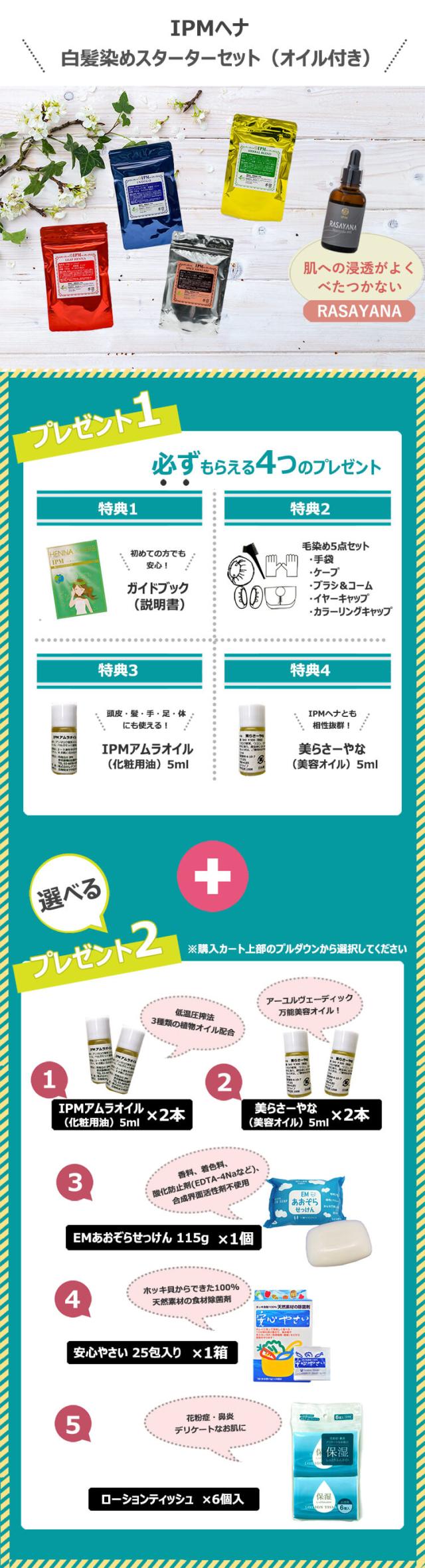 IPMヘナ 白毛染めスターターセット (IPMヘナ4点(各100g)+RASAYANA(美容オイル)+スターターセット) IPM 正規品【外装のみジッパーパウチへリニューアル】