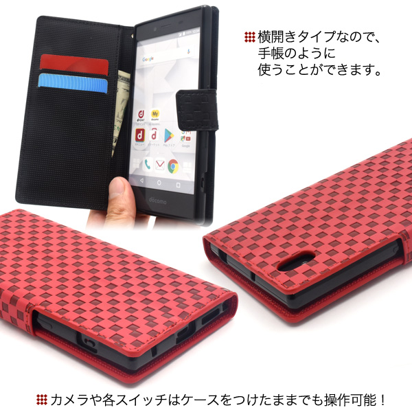 | 存在感抜群!市松模様レザーデザインの手帳型ケース。 衝撃やキズなどからスマホを守ります。また、内部はソフトケースなので着脱が簡単です。 背面を折り返すとスタンドとして使用できるので、動画視聴に便利です。落下防止に便利なストラップとストラップホール付きです。横開きタイプなので、手帳のように使うことができます。 また、内側に2つのカードポケットとサイドポケットが付いています。 ※スマートフォンは付属しません。 ※ライセンス商品ではありません ※カードは付属しません。 | ||||||||||||||