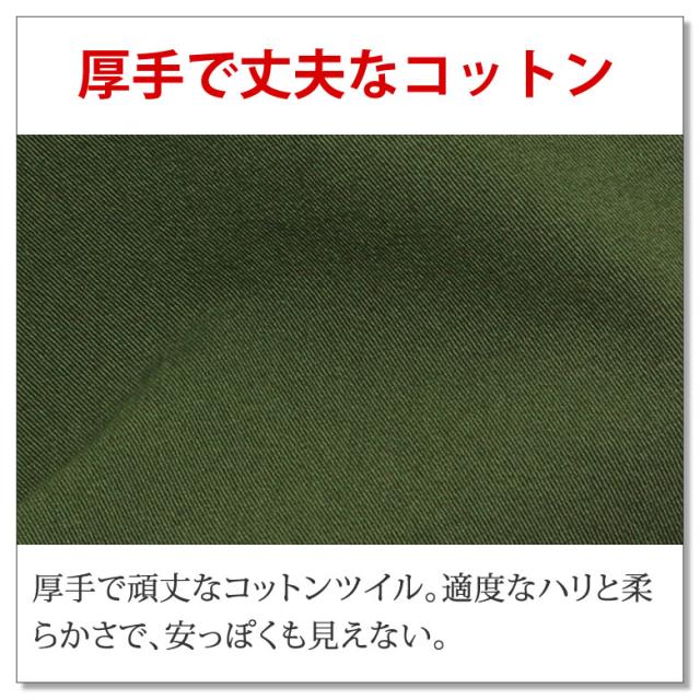 厚手で頑丈なコットンツイル。適度なハリと柔らかさで、安っぽくも見えない。