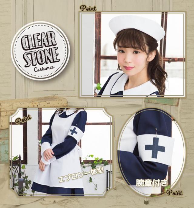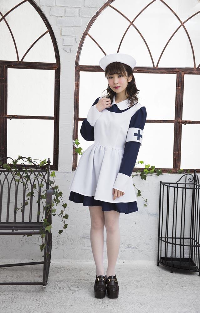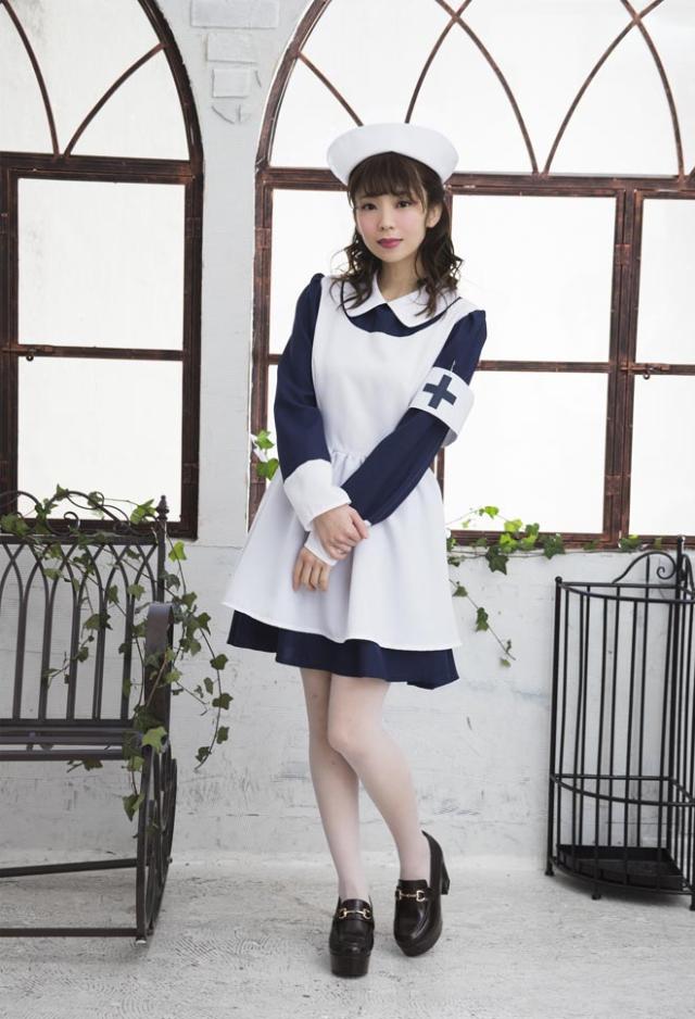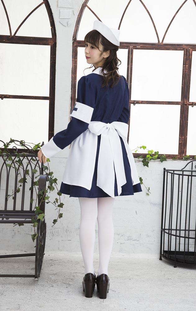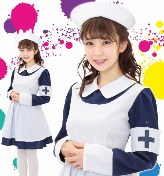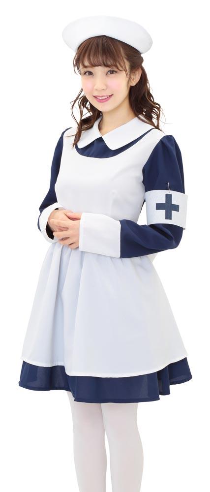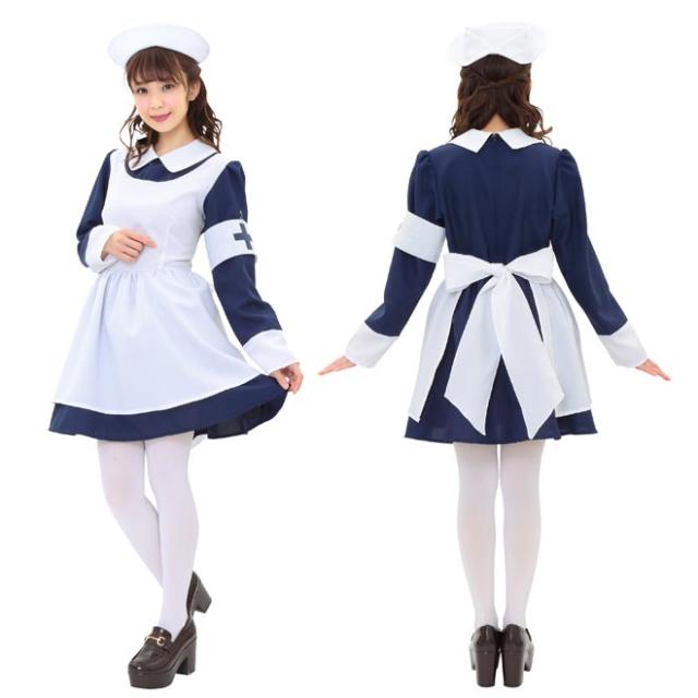 シックなネイビーブルーとフレアスカートのレトロなナースコスチューム。本格的なナースキャップがセットになっています。十字マーク入りの腕章がアクセントに!