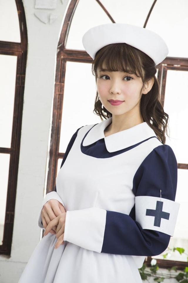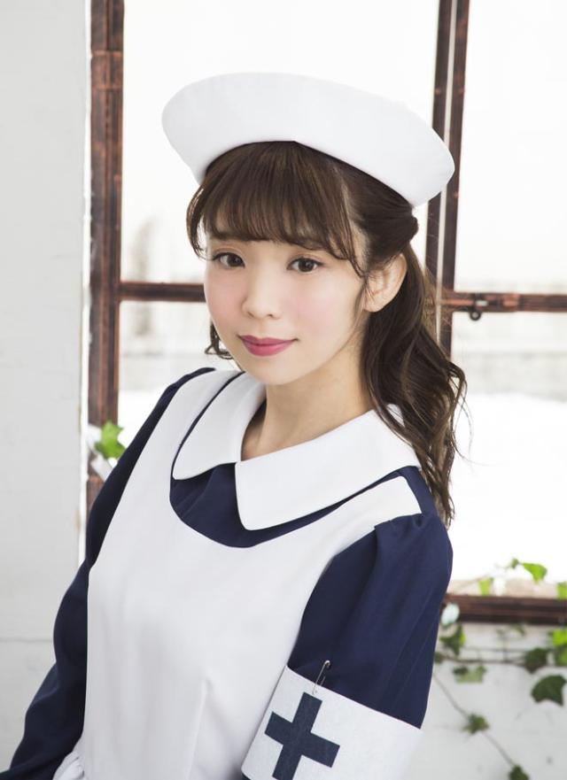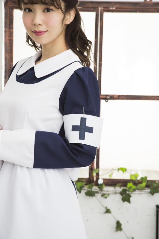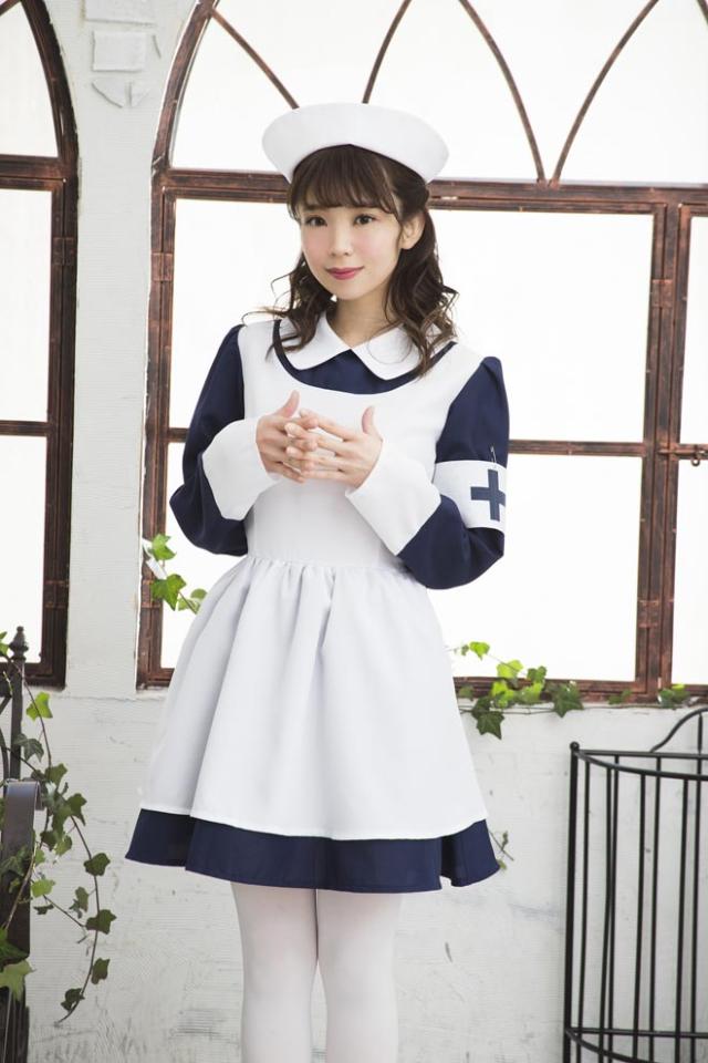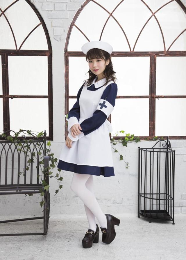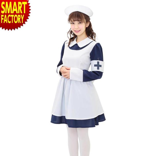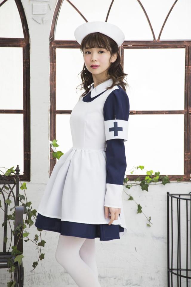 シックなネイビーブルーとフレアスカートのレトロなナースコスチューム。本格的なナースキャップがセットになっています。十字マーク入りの腕章がアクセントに!