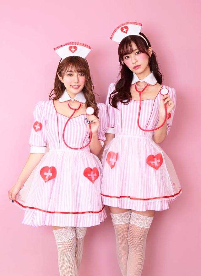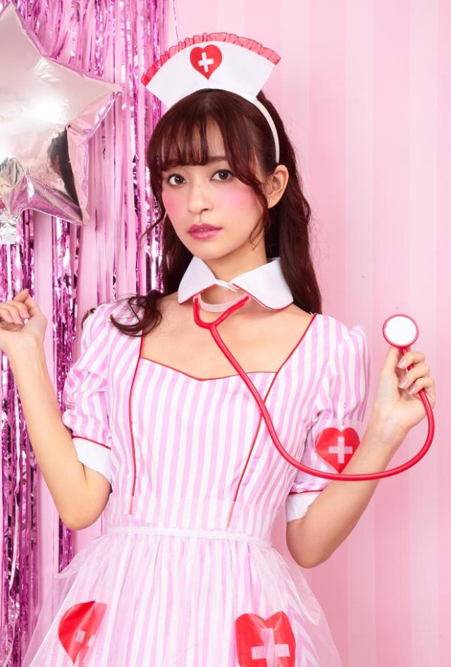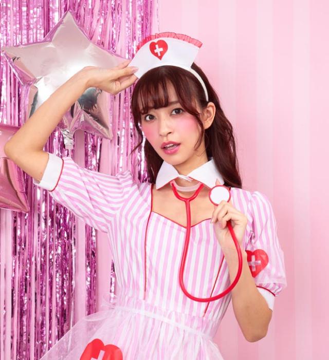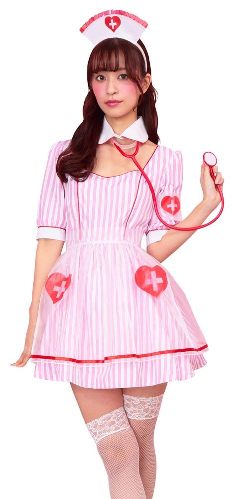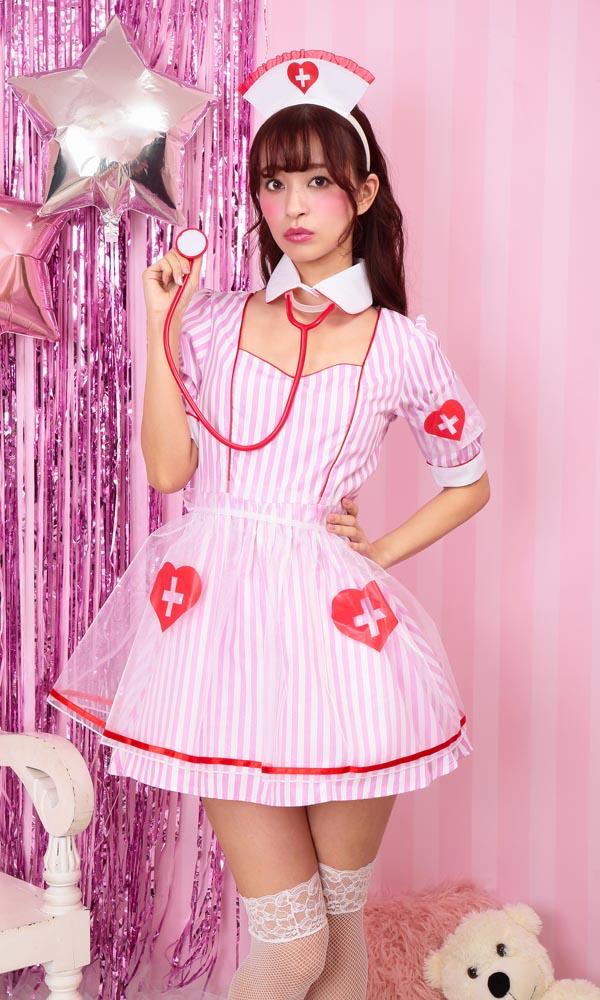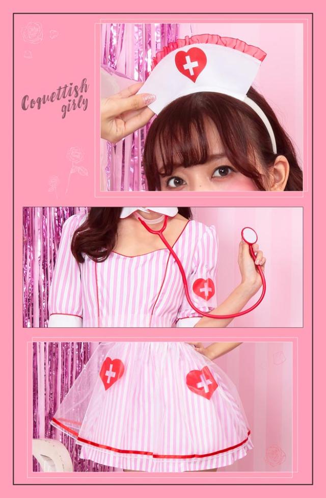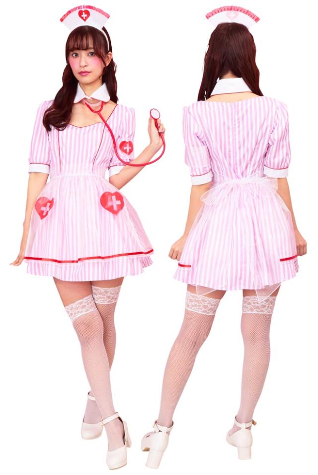 ストライプ生地に、オーガンジーの透けた紋章&エプロンが可愛いナースコスチューム。聴診器付きで充実の6点セット!付け襟と開いた胸元がちょっぴりセクシー。ポップな配色はフォトジェニック!カラバリもあるので双子コーデにもおすすめ。