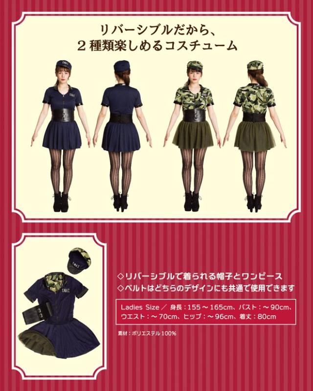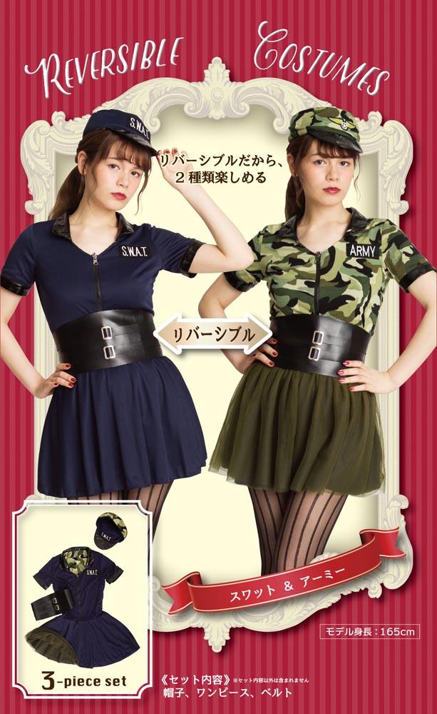 1着で2種類のコスプレが楽しめるリバーシブルになったコスチュームセットが登場!!セット内容が充実していてお得なだけでなく、デザインも可愛い。スワット&アーミーは帽子とワンピースがリバーシブルになっています。コルセット風の太いベルトがセットがだからスタイルアップして着られる。