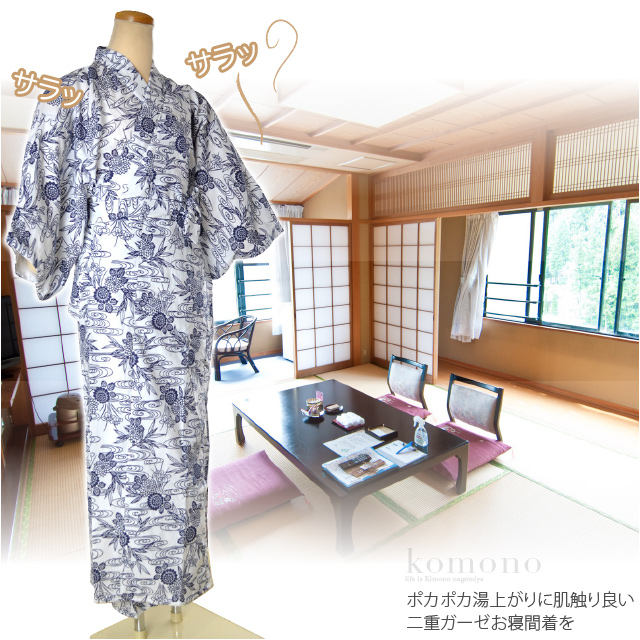 | 備考 | : | ポカポカ湯上がりに肌触り良い二重ガーゼお寝間着を。 綿100%(ガーゼ)素材で汗を吸収し肌触りが良いです。 お風呂上がりや眠る時にサラッとして気持ち良いです。 旅館や病院で入院する時も。 共布の紐が付いています。 身幅がゆったりとしているので、締め付け感がありません。 機械捺染ですが最初の洗濯時では白物との洗濯はさけてください。 ※柄は当店スタッフによるお任せとなります。 ※商品は1点ごとの販売です。 | ||||||||||||||||||
