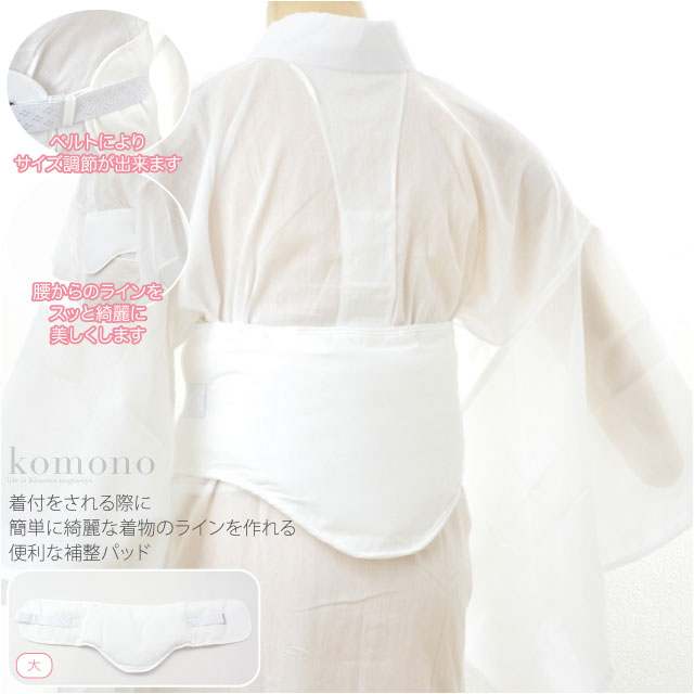 | 備考 | : | 着付をされる際に簡単に綺麗な着物のラインを作れる便利な補整パッドです。 ヒップの小さい方、ウエストの細い方等にお使い頂く用途の広い補整パットです。 面倒なタオル巻きをすることなく新しい感覚で補整できるパットです。 着付け教室生徒さん必見。 着物を着たときの理想は筒型、ストンとした立ち姿です。 こちらの商品は、ウエストからヒップにかけて、パットを使う事により着物向きの筒型体型に整えてくれます。 腰からのラインをスッと綺麗に美しく仕上げ、着くずれの心配も軽減され、着物姿をより楽しめますよ。 防縮加工がされていますので、自宅でお洗濯が可能です。 お太鼓の垂れのはね上がり防止にも。 つけ心地はソフトで紐や帯の締め付けを和らげてくれます。 表地・裏地の素材は綿100%。肌に優しく吸収性、通気性も良いです。 ベルトによりサイズ調節が出来ます。 ※補整具単品商品です。写真の襦袢等は含まれません。 腰部分だけ少し補整したい方、好パット小はこちらから購入できます。 | ||||
