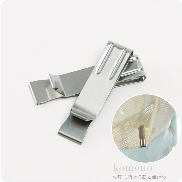 | 備考 | : | お太鼓の型崩れをこのお太鼓止めを使うことで、防止。 女結びや貝の口の固定にも。 帯を二巻きした後、下帯線の所を止金具で固定します。 結ぶ必要がないので帯を痛めません。 2個入りです。 ※お太鼓止め単品商品です。写真の着物等は含まれません。 | ||||