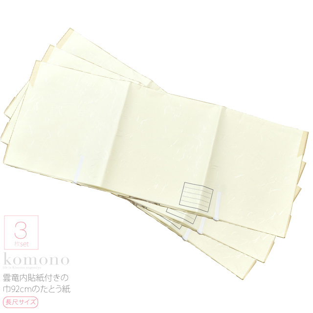 | 備考 | : | あづま姿のたとう紙3枚セットです。 着物や帯を入れて保存するものです。 湿気にくい和紙タイプがお勧めです。 ただし、古いたとう紙は要チェック。 黄変(茶色く変色している)した、たとう紙は、せっかく綺麗にクリーニングしても茶色が移ってしまう可能性があるので新しくしましょう。 巾92cmの長尺サイズですので、着物が二つ折りで収納できます。 小窓が手前に付いているので、開封しなくても中の着物を確認できます。 着物にやさしい高級雲竜和紙(内貼紙)付きです。 メモ欄があります。 綿の紐になっているので、結ぶのも楽です。 ※三つ折りにしてお届けになります。 帯用たとう紙はこちらから購入できます。 | ||||