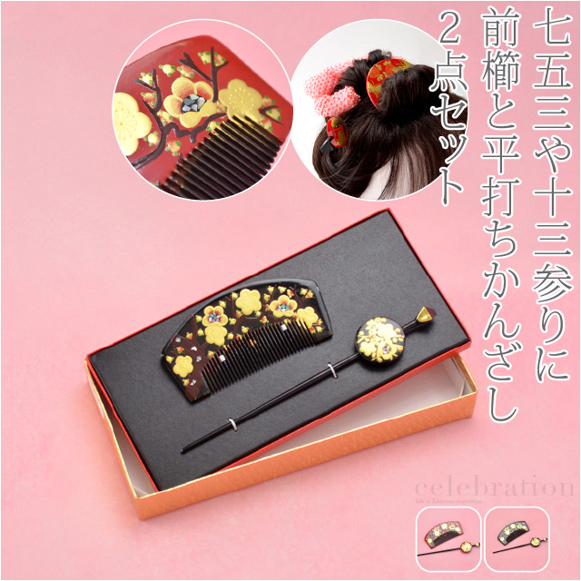七五三 髪飾り 7歳 通年用 日本製 前櫛 平打簪セット 梅 かんざし+くし 礼装 子供 女の子 女児10014477