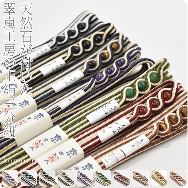 上品な天然石が付いた国産老舗、翠嵐工房謹製の正絹三分紐です。
