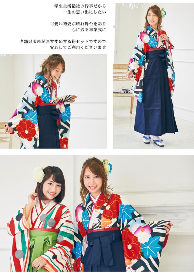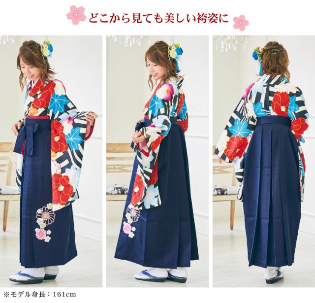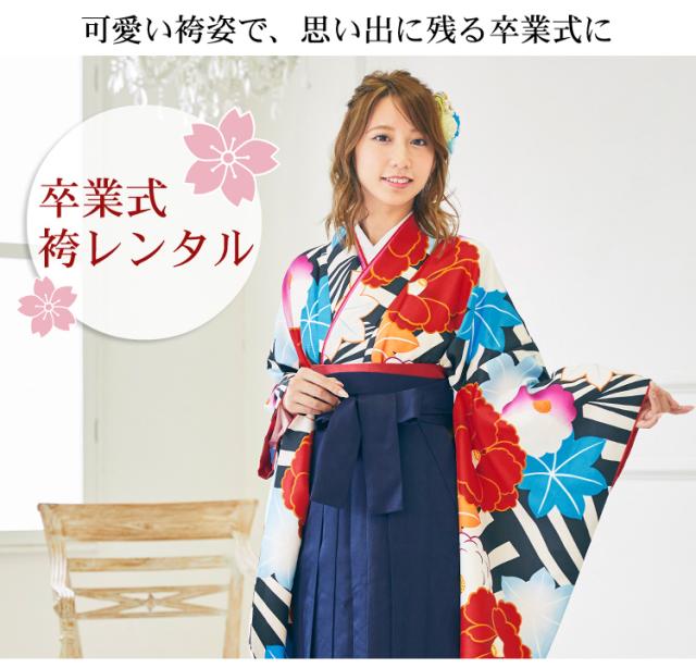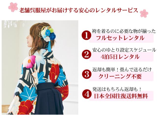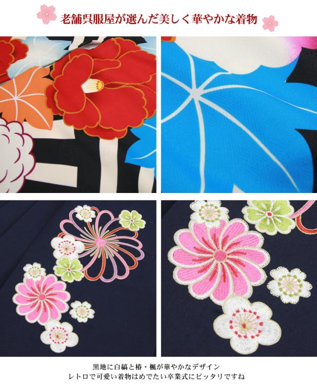 卒業式 袴 レンタル 女 袴セット 卒業式袴セット 2尺袖着物&袴 フルセットレンタル 「黒地に白縞と椿・楓」レトロ モダン
