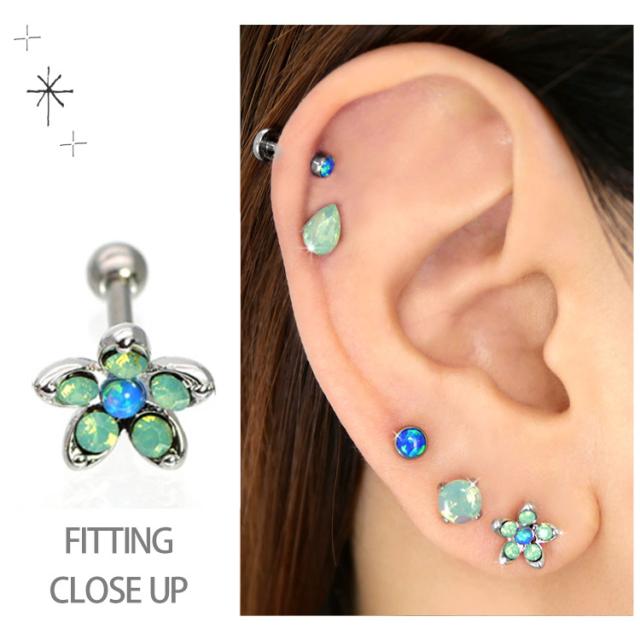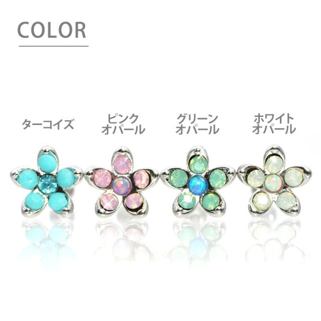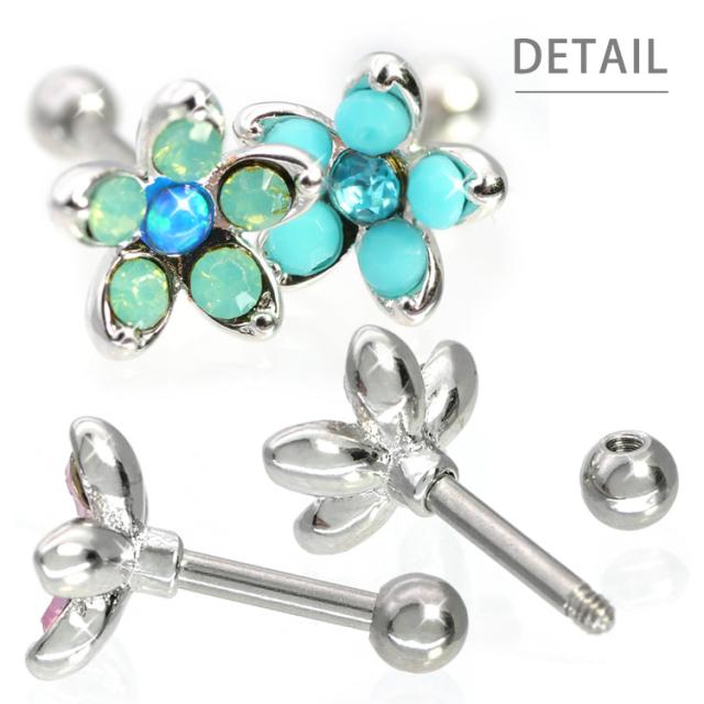 立体的なお花モチーフが目を惹くのバーベルピアス。オパールは幻想的な虹色の優しい輝きで目を惹き、ターコイズは落ち着いた爽やかさで、存在感を出してくれます。どこの部位に着けても、優しげで可憐な女性らしさを演出してくれますよ。太さのサイズは人気の16ゲージをご用意。素材はアレルギーが起きにくいサージカル(医療用)製で安心です。