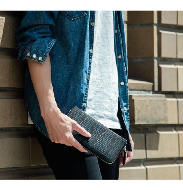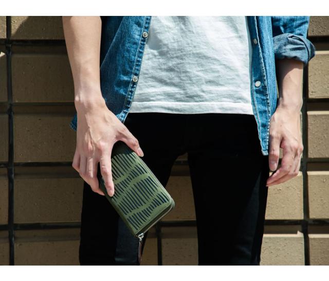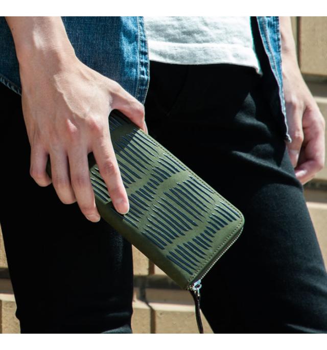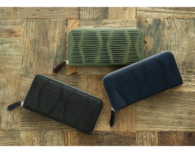 ファスナータイプでカジュアルに使える長財布。不規則な引っかき傷がそのままデザインになったお洒落なアイテムです。