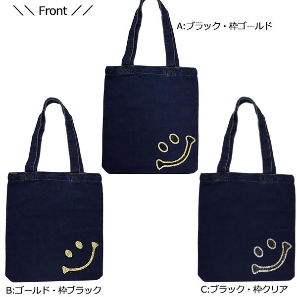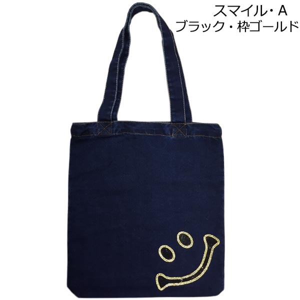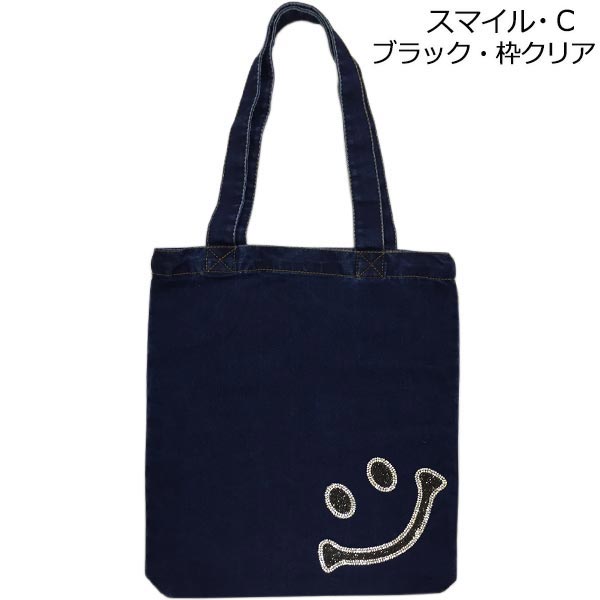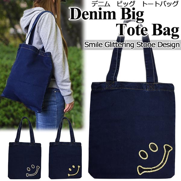 デニム トートバッグ スマイル キラキラストーン BIGデニムバッグ ストーンワッペン ビッグトート バッグ 母の日 プレゼント ギフト