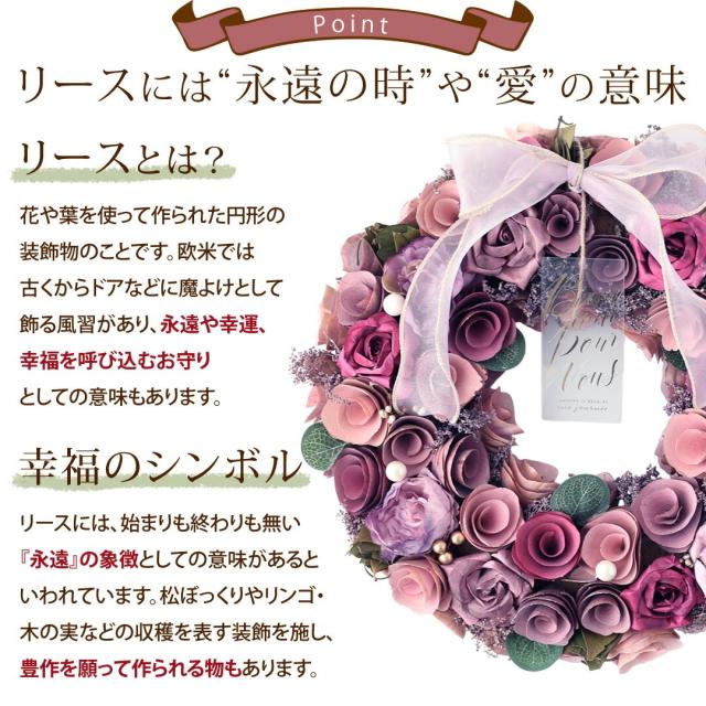 - いつもの鉢植えの花と違うものを探していたところ、こちらのリースが目にとまり、母の日のプレゼントで購入しました。主人の母も実家の母も、豪華で可愛いととっても喜んでくれました。希望通りに母の日の前日に届け...