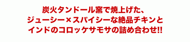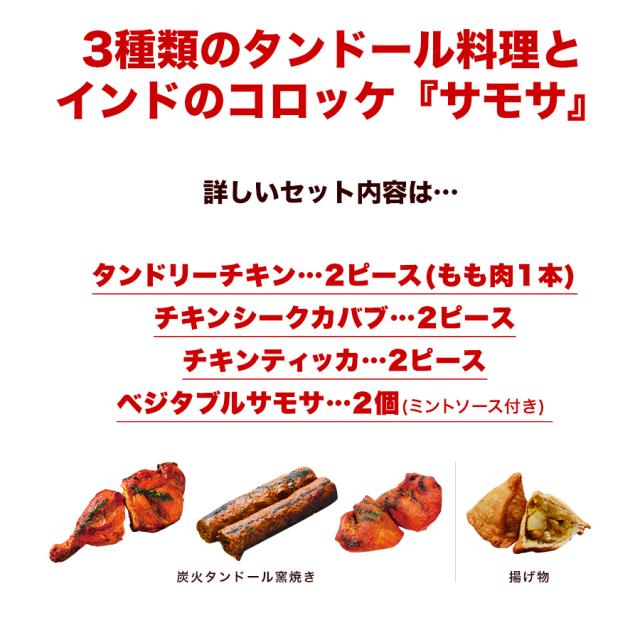 内容量 タンドリーチキン(2ピース)、チキンシークカバブ(2ピース)、チキンティッカ(2ピース)、ベジタブルサモサ(2ピース)