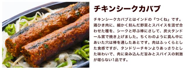 【チキンシークカバブ】鶏肉、玉ねぎ、ピーマン、しょうが、にんにく、にんにくの芽、香菜、ガラムマサラ、クミン、コリアンダー、クミンシード、チャートマサラ、カスリメティ、赤唐辛子、食塩、レモン