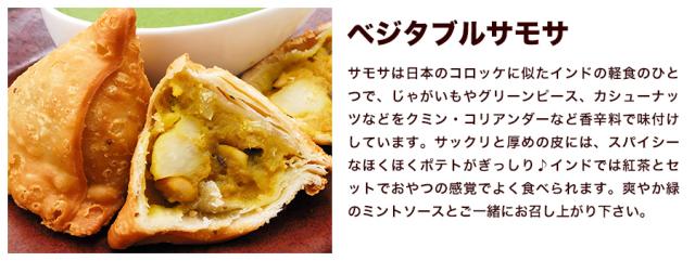 【ベジタブルサモサ】小麦粉(強力粉)、じゃがいも、グリーンピース、カシューナッツ、ジンジャー、クミンシード、コリアンダー、レッドチリ、アジュワイン、ガラムマサラ、食塩