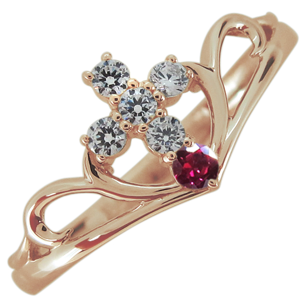 7月誕生石ルビーを使用した10金製の、クロスモチーフのV字デザインリング(指輪)です。