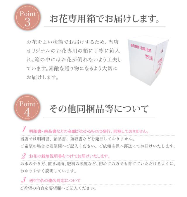 商品到着時、植物に損傷があった場合は、すぐにご連絡ください。同等品のお花を再送いたします。