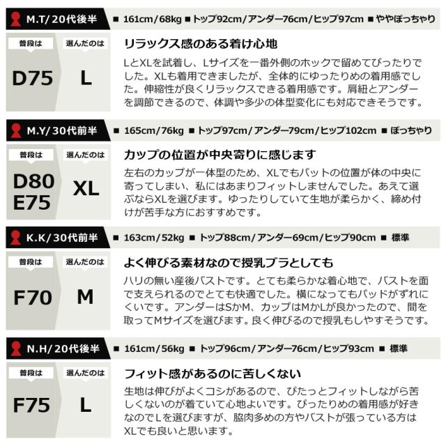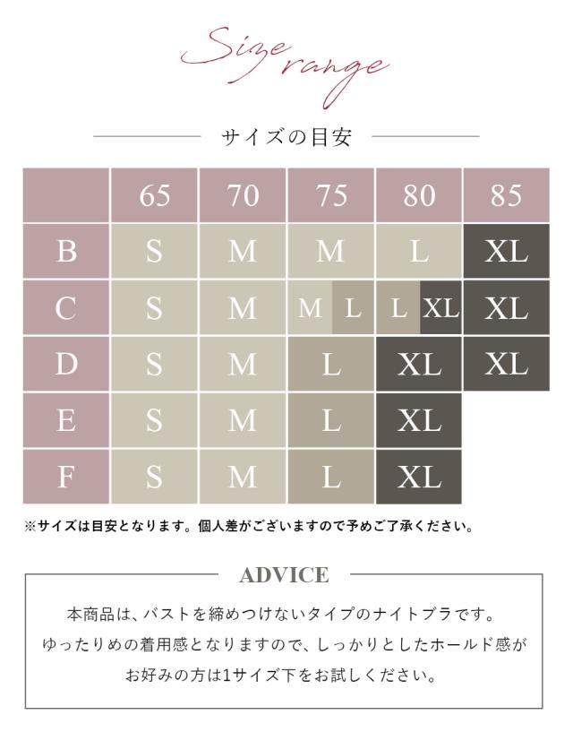 | S / M / L / XL 《対応サイズ目安》 S:B65 C65 D65 E65 F65 M:B70 B75 C70 C75 D70 E70 F70 L:B80 C75 C80 D75 E75 F75 XL:B85 C80 C85 D80 D85 E80 F80 ※本商品は、バストを締めつけないタイプのナイトブラです。 ゆったりめの着用感となりますので、しっかりとしたホールド感がお好みの方は1サイズ下をお試しください。 |