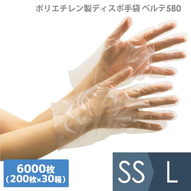 ミドリ安全 ポリエチレン製ディスポ手袋 ベルテ580 クリア SS〜L 6000枚入(200枚×30箱)