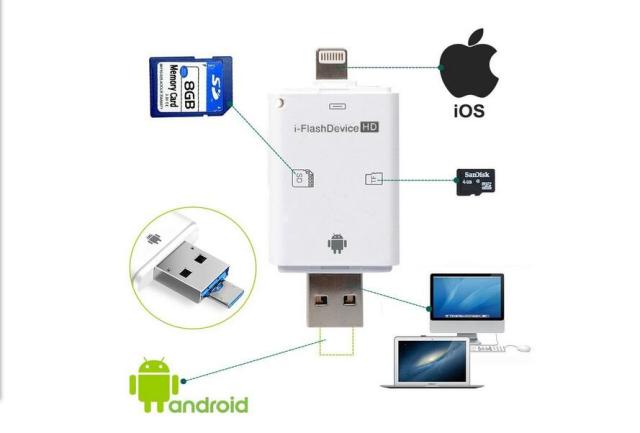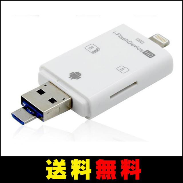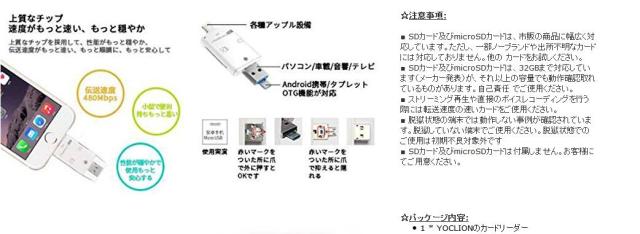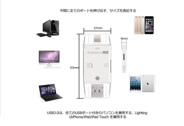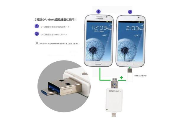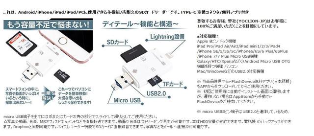 ☆iPad4/iPhone5以降の8ピン ドック タイプとPC/MAC用USB2.0とアンドロイドスマホ用のMicro USB 5ピンへのの3タイプの端子を備えています。PC/MACとiPad/iPhone/アンドロイドスマホOTG間でデータのやり取りができます。※PC?SDカード間
