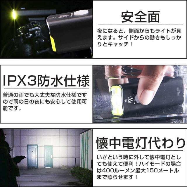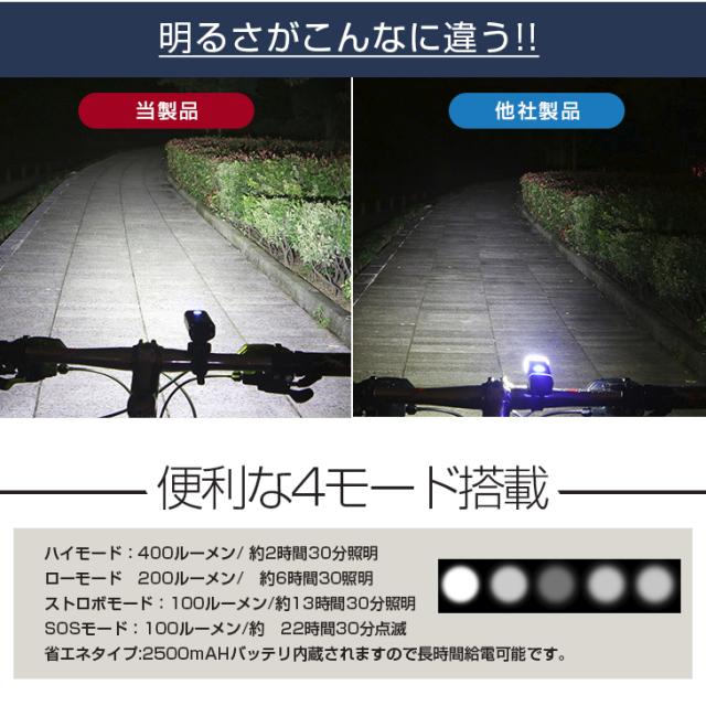 【送料無料】自転車 アルミ製 LEDライト 400ルーメン 高輝度IPX3防水 2500mAH バッテリ内蔵 一年保証 USB充電