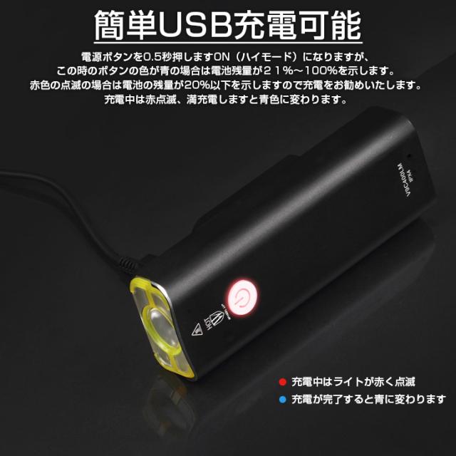 【2500mAhリチウムイオン充電池&USB充電】2500mAhリチウムイオン充電池(18650バッテリー)の採用で、自転車ライトはUSB充電タイプになります(Micro-USBケーブル付属)。本体に急速充電回路内蔵のため、充電時間を6時間から3.5時間に短縮しました。ライト内部構造が複雑なので電池を取り出して交換することができません。電池に問題ある場合は、当社にお問い合わせいただき、交換修理するようお願いいたします。 充電のタイミングが分かるバッテリーインジケータ・充電インジケータ搭載、充電残量が20%以上では、電源ボタンの青ランプが点灯し、充電残量が20%以下になると、電源ボタンの青ランプの点灯から赤い点滅に変わり通知してくれます。充電式なので繰り返して充電することができますので電池の交換が不要であり、さらに経済的です。