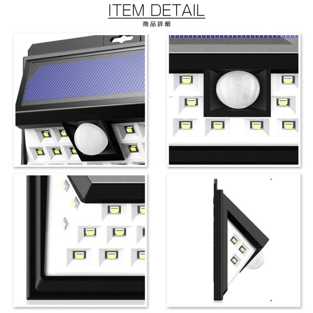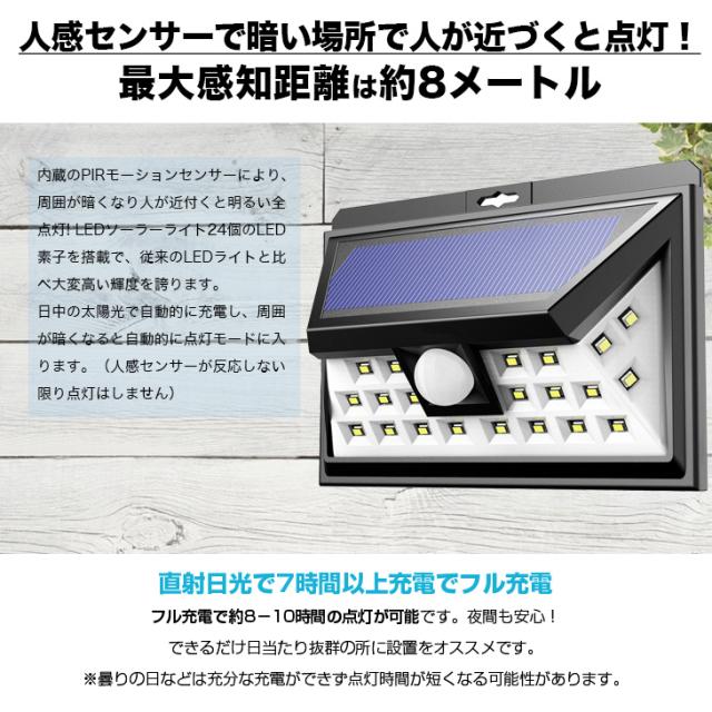 内蔵のPIRモーションセンサーにより、周囲が暗くなり人が近付くと明るい全点灯! LEDソーラーライト24個のLED素子を搭載で、従来のLEDライトと比べ大変高い輝度を誇ります。