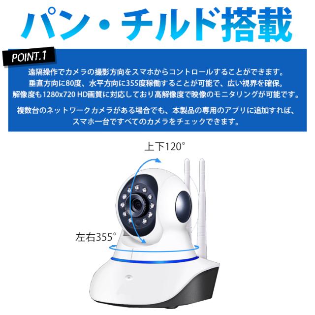 垂直方向に80度、水平方向に360度稼働することが可能で、広い視界を確保。解像度も1280x720 HD画質に対応しており高解像度で映像のモニタリングが可能です。