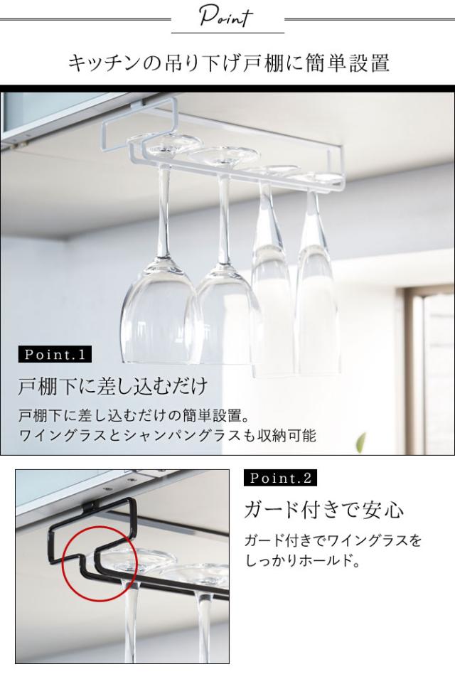 ワイングラス・シャンパングラスの収納にピッタリの戸棚下グラスホルダーです。穴あけ・ネジ止め不要で吊戸棚に簡単に取り付けられます。