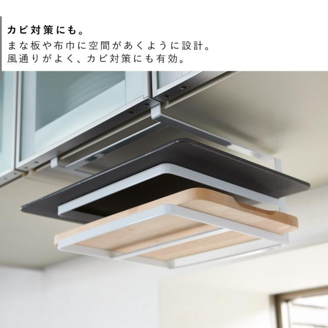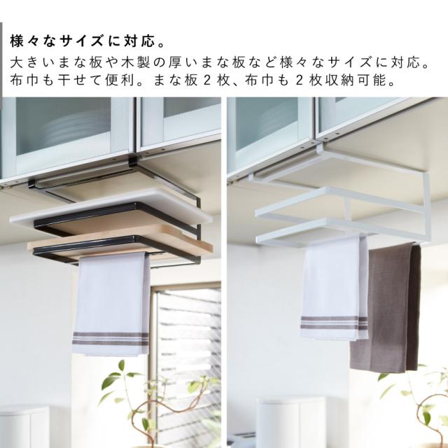 大きいまな板や木製の厚いまな板など、様々なサイズに対応。布巾も干せる便利な戸棚下まな板&布巾ハンガー。戸棚下に本体を差し込むだけ。浮かせて収納できデッドスペースを有効利用。キッチン周りを広く使えるようになります。まな板2枚、布巾も2枚収納することができます。