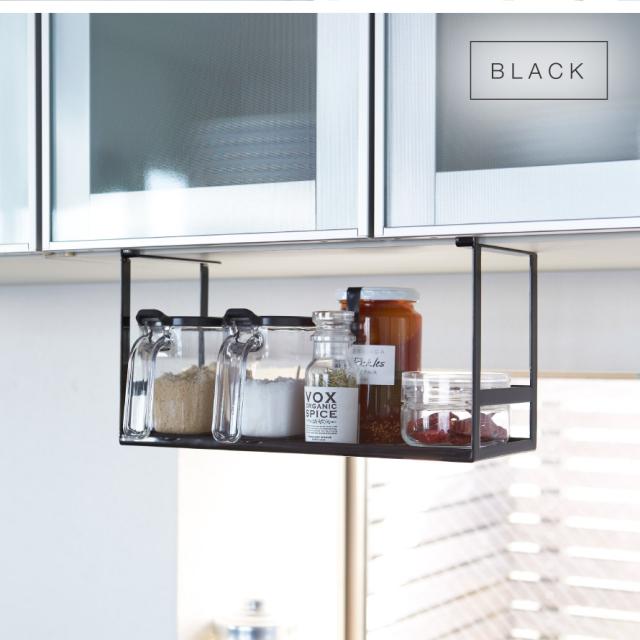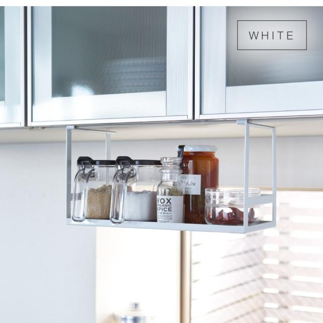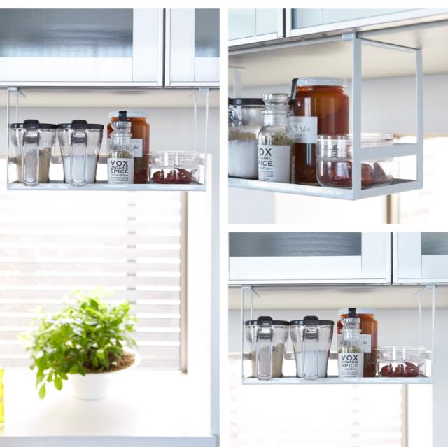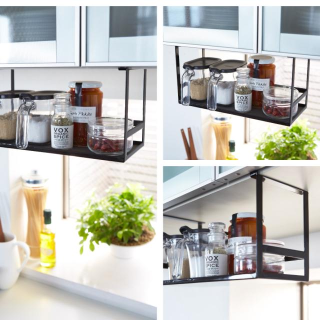 戸棚下に本体を差し込むだけ。浮かせて収納できてデッドスペースを有効利用できるスパイスラック。よく使う調味料やキャニスターなど、様々なキッチン小物の収納に便利。キッチン周りをオシャレに見せてくれます。