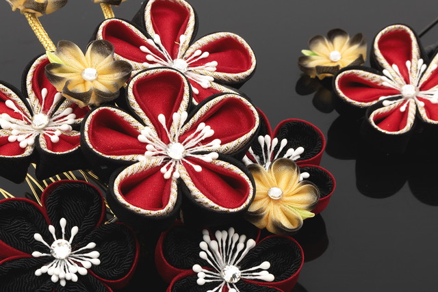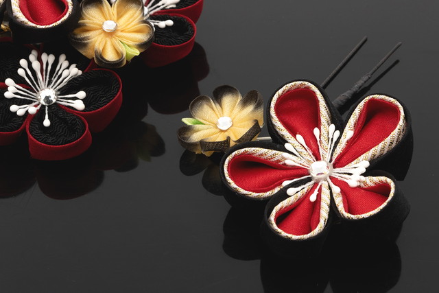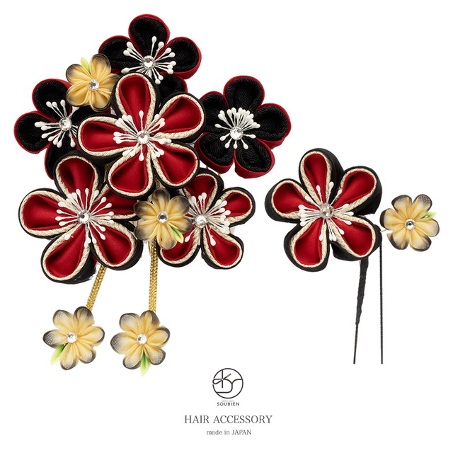 成人式 髪飾り 成人式の髪飾り つまみ細工 2点セット 赤 レッド 黒 梅 うめ 花 コサージュ ラインストーン コーム Uピン 髪留め ヘアアクセサリー 振袖向け 卒業式 日本製 和装